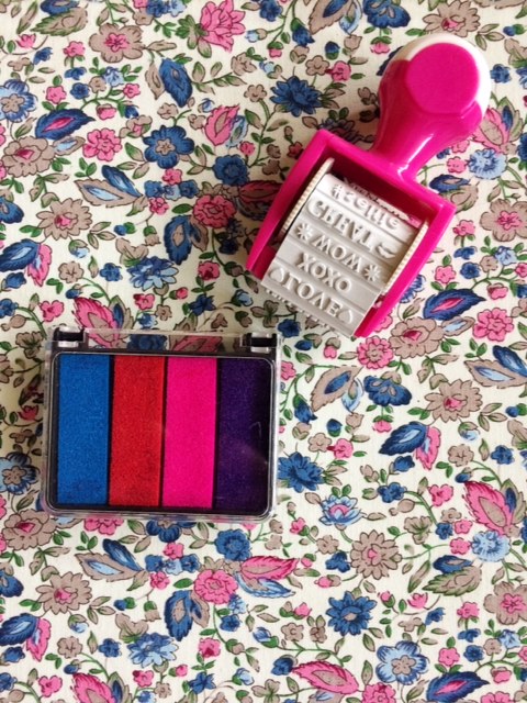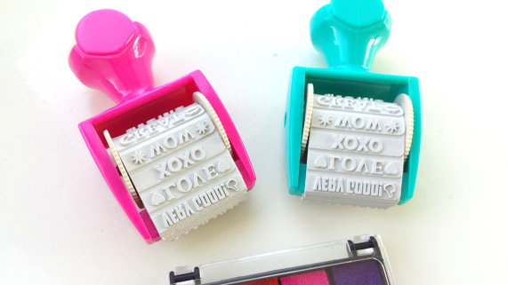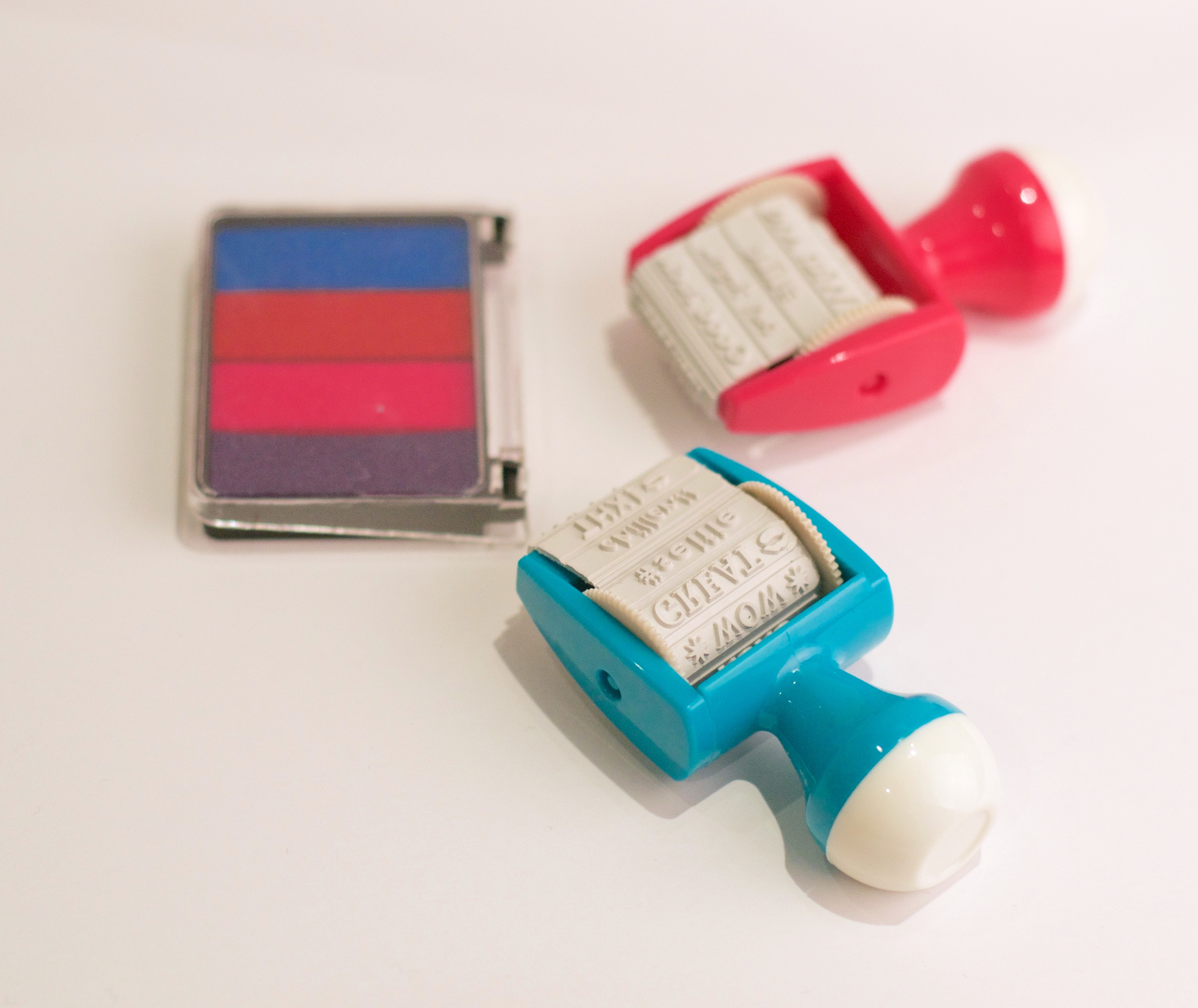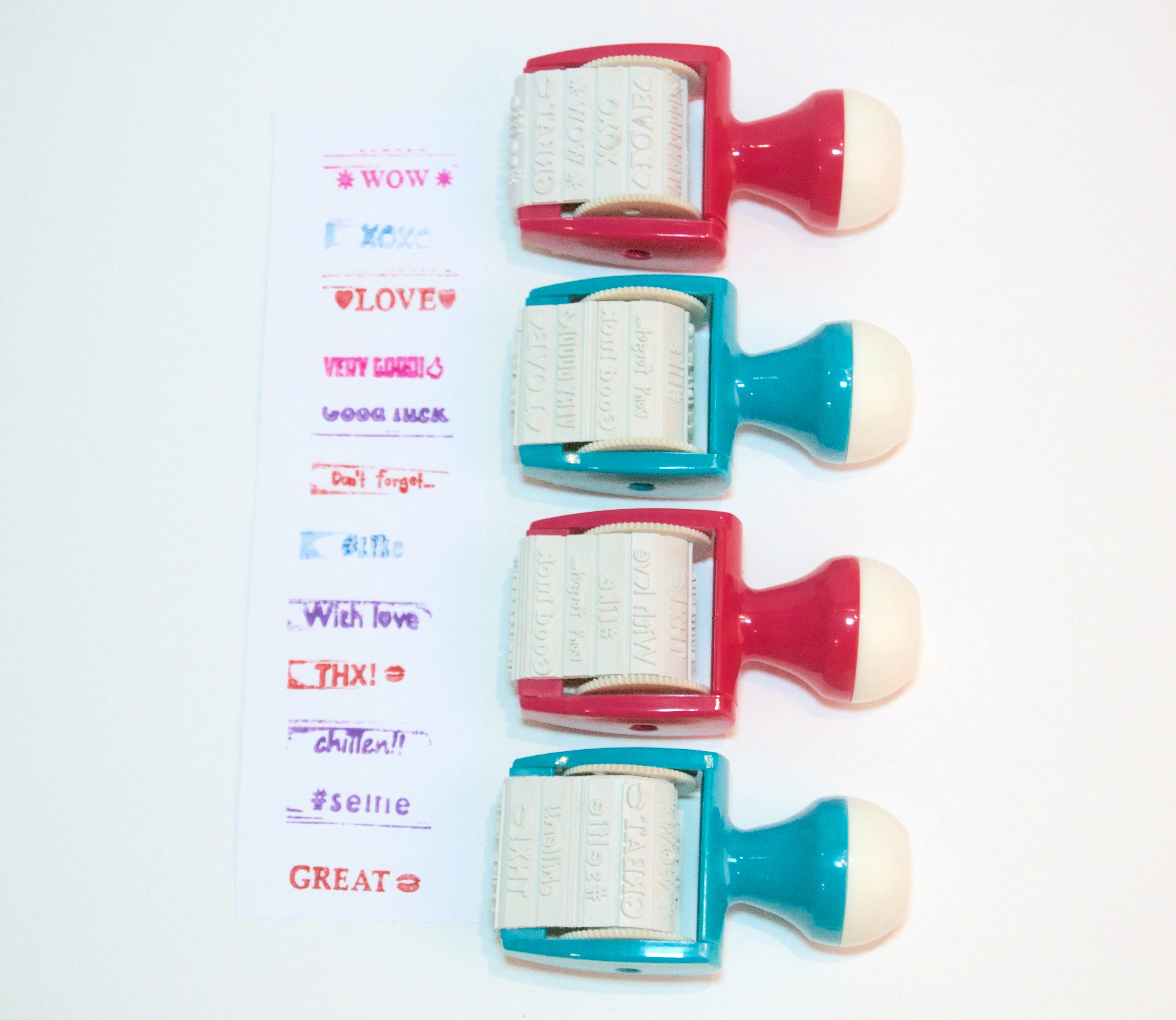 Rotirajući gumeni žig dostupan je u rozoj i plavoj boji. Gumena površina sadrži 12 različitih fraza a uz žig dobiti ćete i jastučić s tintom sa 4 boje: plava, crvena, roza i ljubičasta.